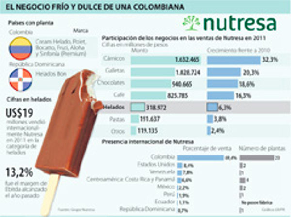 Al cierre de 2011, la ventas de helados del grupo en República Dominicana cerraron en $35.650 millones, lo que representó 11,2% del total comercializado por la empresa colombiana en esta categoría. Esta cifra es siete veces superior a los $5.976 millones invertidos a modo general durante el año pasado en este segmento, lo que sugiere que el negocio le ha dado buenos resultados.
