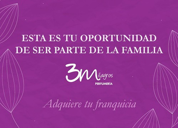 El sistema de la franquicia 3 milagros®, ofrece una excelente oportunidad de desarrollar su propio negocio con una baja inversión, excelente rentabilidad y rápido retorno de inversión; la cual se centra en la elaboración, distribución y comercialización de productos cosméticos de alta calidad, con cobertura a nivel nacional e internacional, elaborados frente al cliente a su gusto exacto, muchos de nuestros clientes se han convertido en franquiciados al conocer la calidad de nuestros productos.